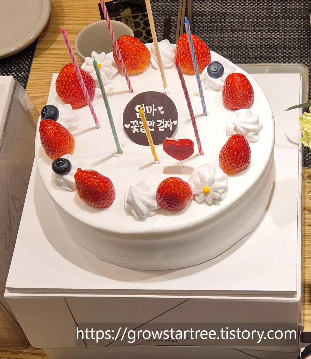 제 눈에는 하얀 생크림에 빨간 딸기와 블루베리가 올라간 케이크가 더 예뻐보여서 이걸로 픽했답니다.