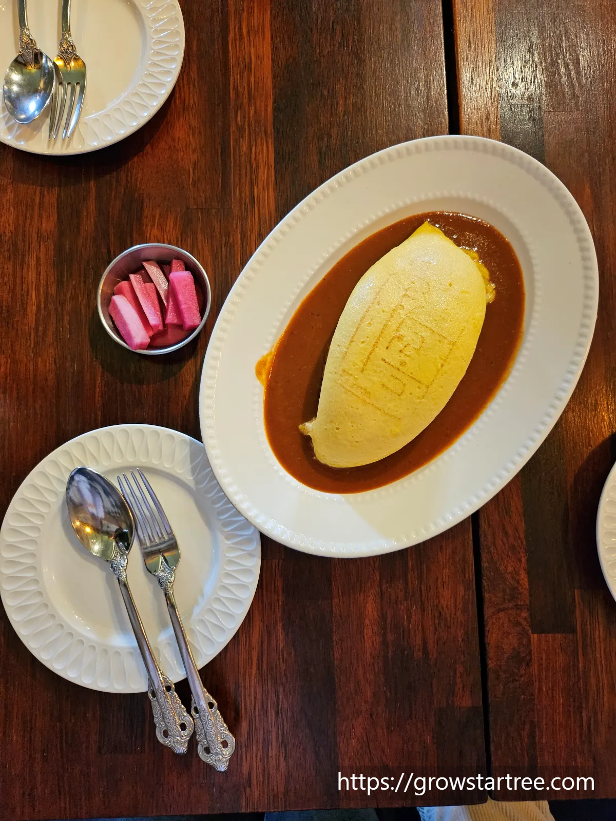 매끈매끈 부드러운 오믈렛이 먼저 나왔어요. 직원분께서 칼로 가운데를 살짝 잘라주시면 오믈렛이 양쪽으로 열리는데요. 안에는 흑돼지 김치볶음밥이 들어있어요. 김치가들어가서 김치향이 강할 것 같은데 그렇지 않더라고요. 부드러운 계란오믈렛과 속안에 흑돼지김치볶음밥을 특제 새우소스와 함께 먹으니 조화로운 맛이 느껴졌어요.