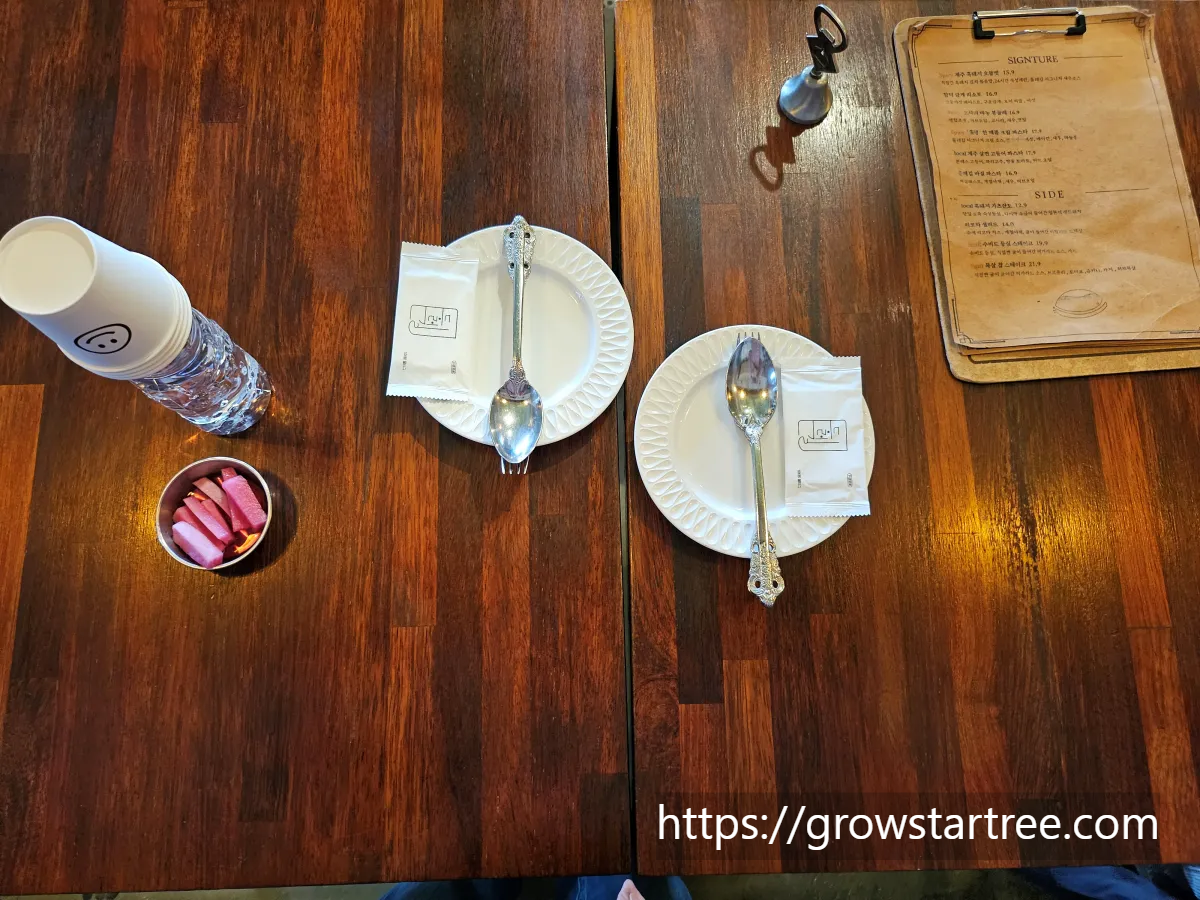먼저 테이블에 숟가락, 포크, 물, 메뉴판을 가져다 주셨어요.