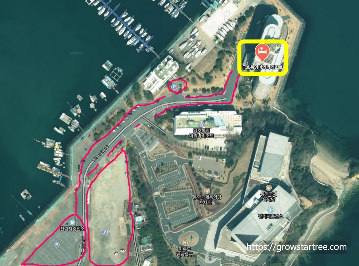 위에 사진에 주차장이 어디있는지 그려보았어요. 노란네모박스가 금호통영마리나리조트이고, 붉은 선으로 그린부분이 주차할 수 있는 곳이에요. 주차는 무료입니다.