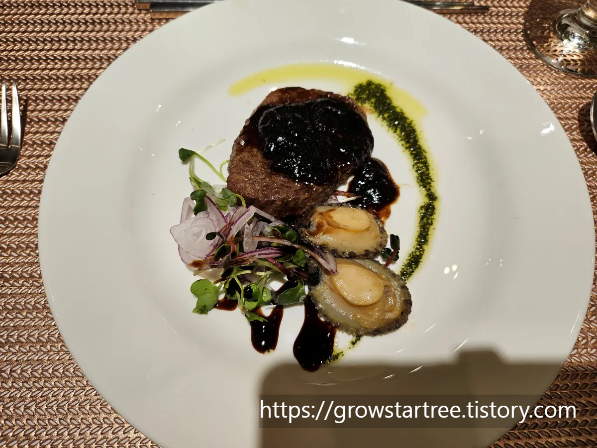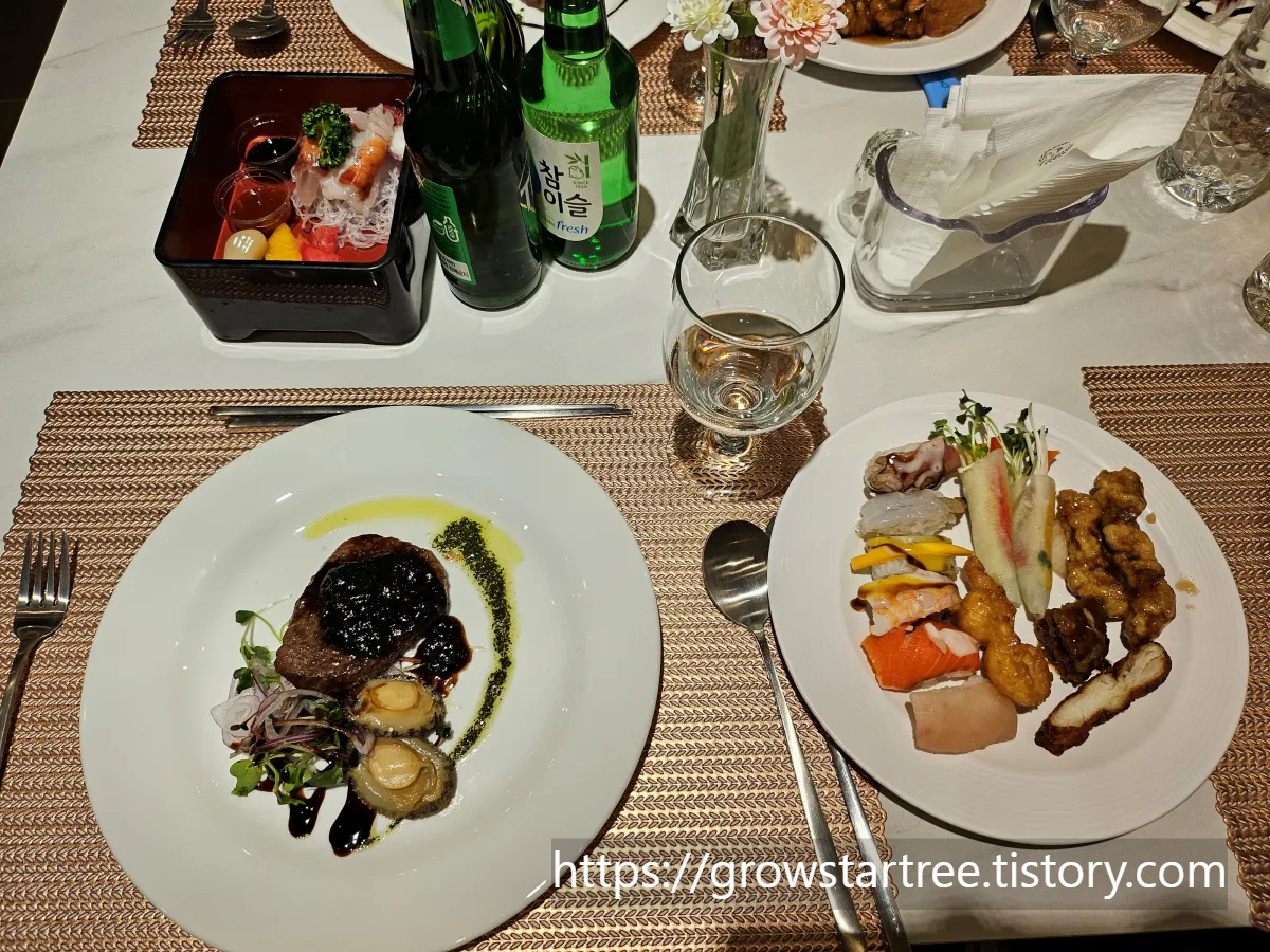 두께가 얇아서 양이 조금 적은데, 저는 초밥과 탕수육, 무쌈말이, 딱새우와 함께 먹었고, 다른 음식들도 먹을게 많아서 저는 적당하다고 느꼈어요. 스테이크 좋아하시는 분들은 부족하다고 느끼실 수도 있어요.