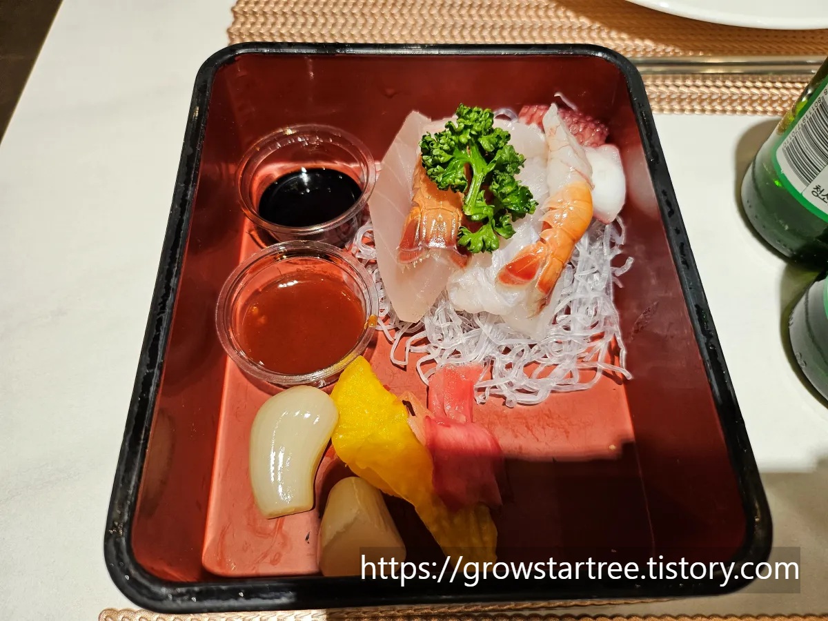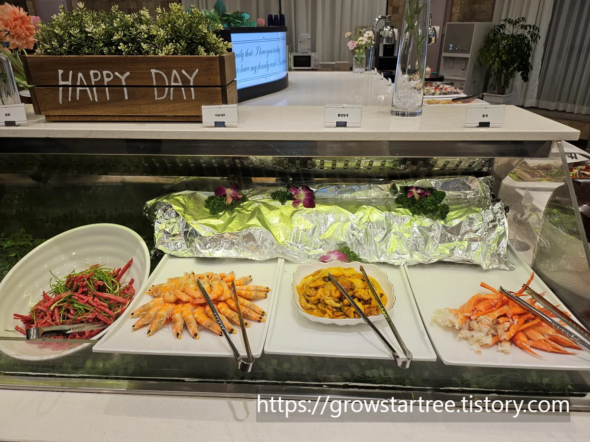 육회, 자숙새우, 멍게, 홍게, 잔치국수가 있었어요. 이건 시작일뿐...