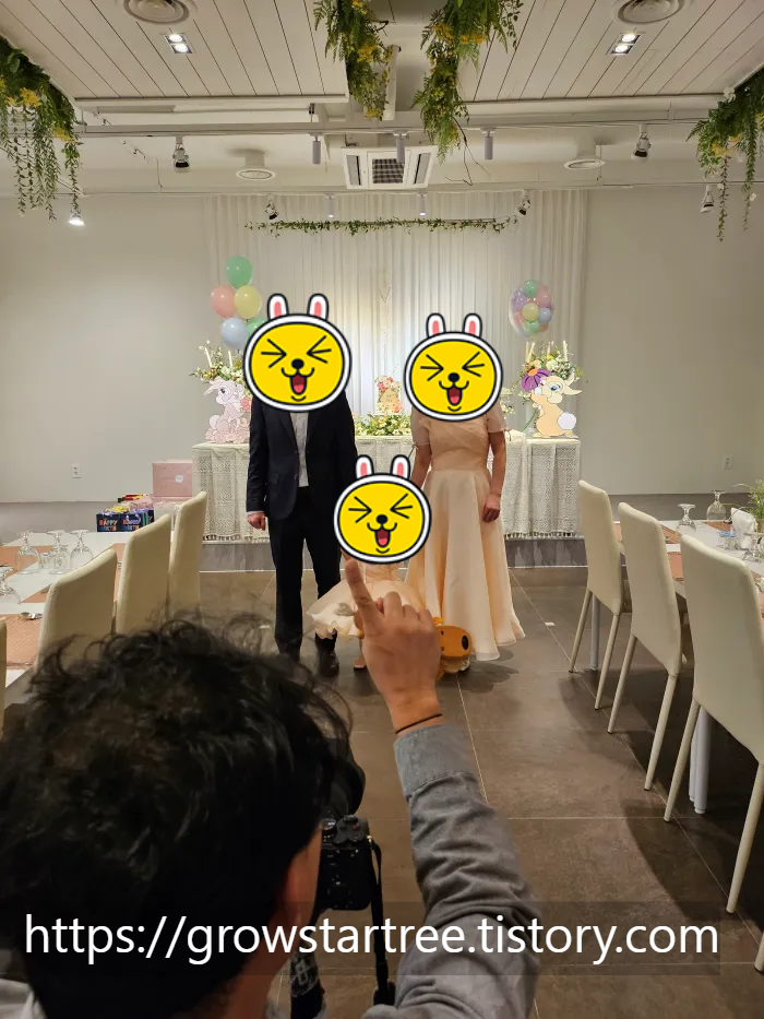 입구에 계신 직원분이 손등에 스티커를 붙여주셨고 바로 파티룸으로 입장을 했어요. 동생과 올케와 조카는 스냅사진을 찍느라 바빠보였어요. 저희 가족은 어디 앉을까 고민하며 둘러보다가 자리를 정해서 앉았습니다.